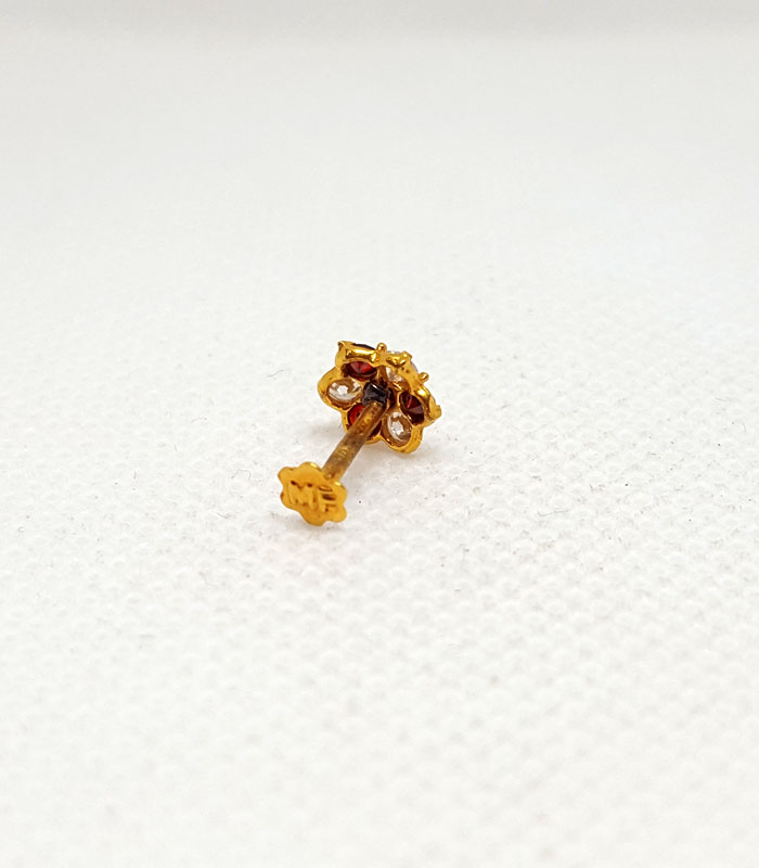Gold Nose Pins NP0111 Net Weight: 0.270 Grams Exclusive Deal Nose Pin With Red and White Stones Gold Nose Pin With Gold Stopper 7 Days Return Policy Free Shipping